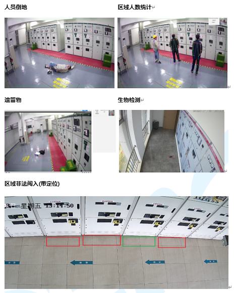 l 支持危險區域非法闖入、警戒線、人員倒地、固定區域人數統計、帶點間隔人員入侵定位功能;